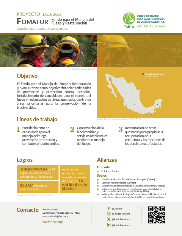 The objective of the Fire and Restoration Management Fund (Fomafur, acronym in Spanish) is to finance and strengthen fire protection activities, integrated fire management, and the restoration of areas affected by fire in top priority regions for biodiversity in Mexico.